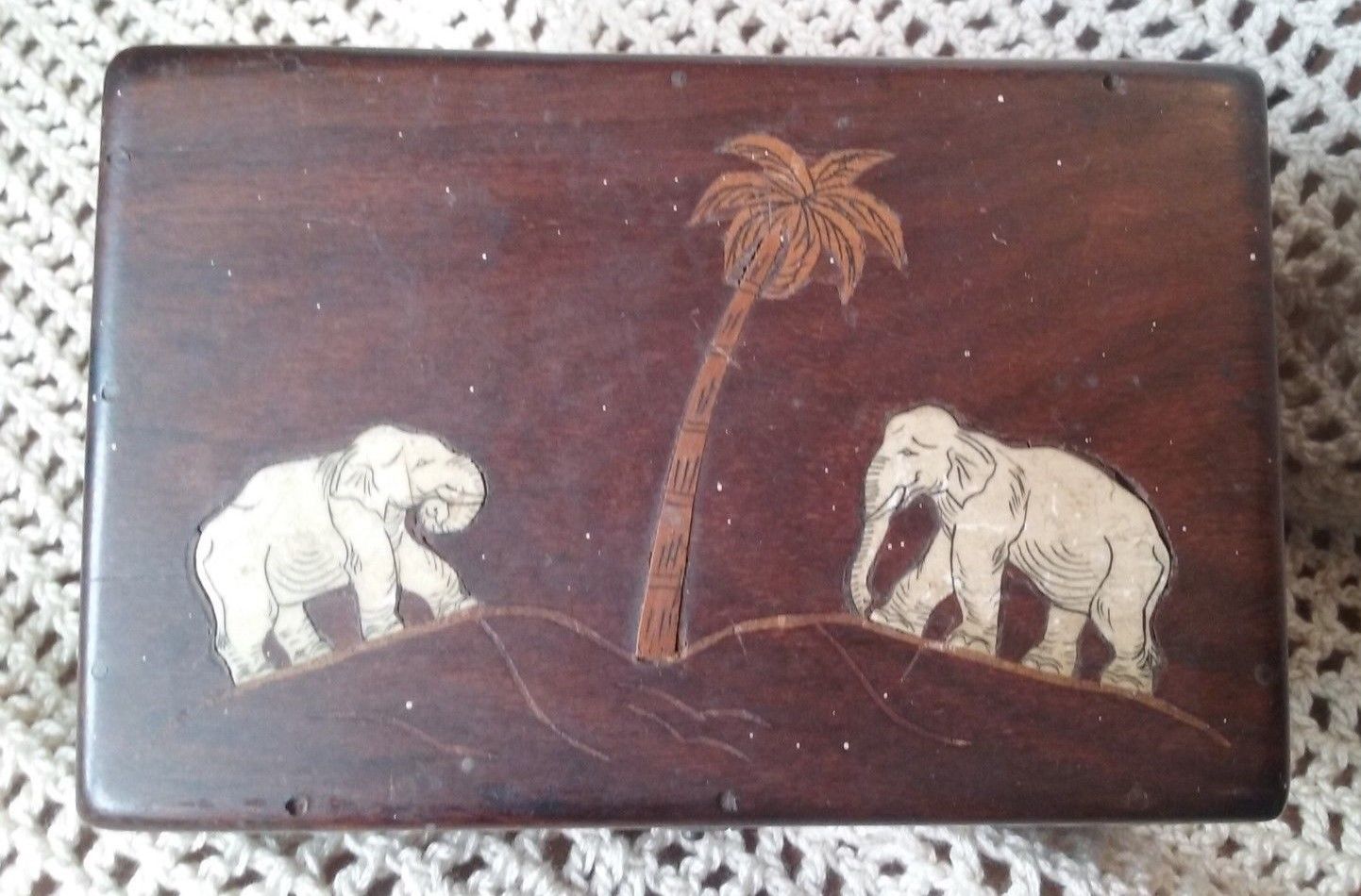 Title (ebay affiliate link): Antique Dark Exotic Wood Jewelry Box, Marquetry Elephants, Upholstered