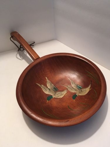 Vintage MUNISING Footed Wooden Bowl With Handle Ducks Painted