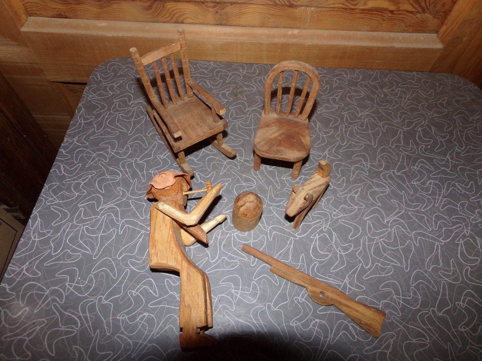 Title (ebay affiliate link): Vintage Hand Carved Wood Hillbilly Dog Gun Whiskey Jug Figurine Set