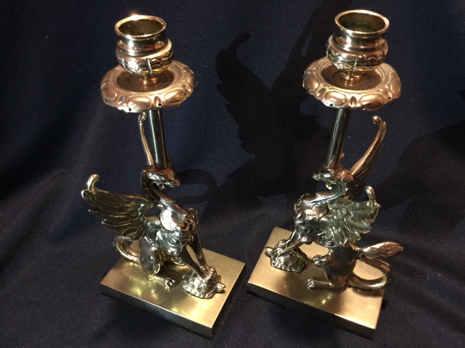 *NO RESERVE* Pair Antique Victorian Winged Griffins Gargoyle Bronze Candlesticks