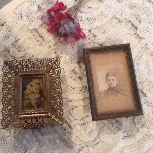 2 Antique Mini Gold Metal Picture Frames Vintage Photo Very Old