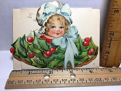 Vintage Christmas Card, Nister, die cut, MINT RARE, Bavaria, Girl in holly