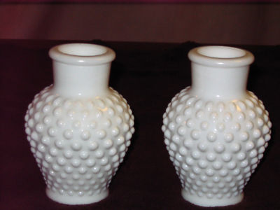 A PAIR OF VINTAGE HOBNAIL MILK GLASS VASES