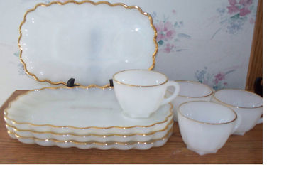 4 White Milk Glass Snack Sets Gold Trim Cups Plates
