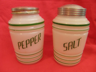 Hazel Atlas Salt & Pepper Shakers - Milk Glass w/ Green