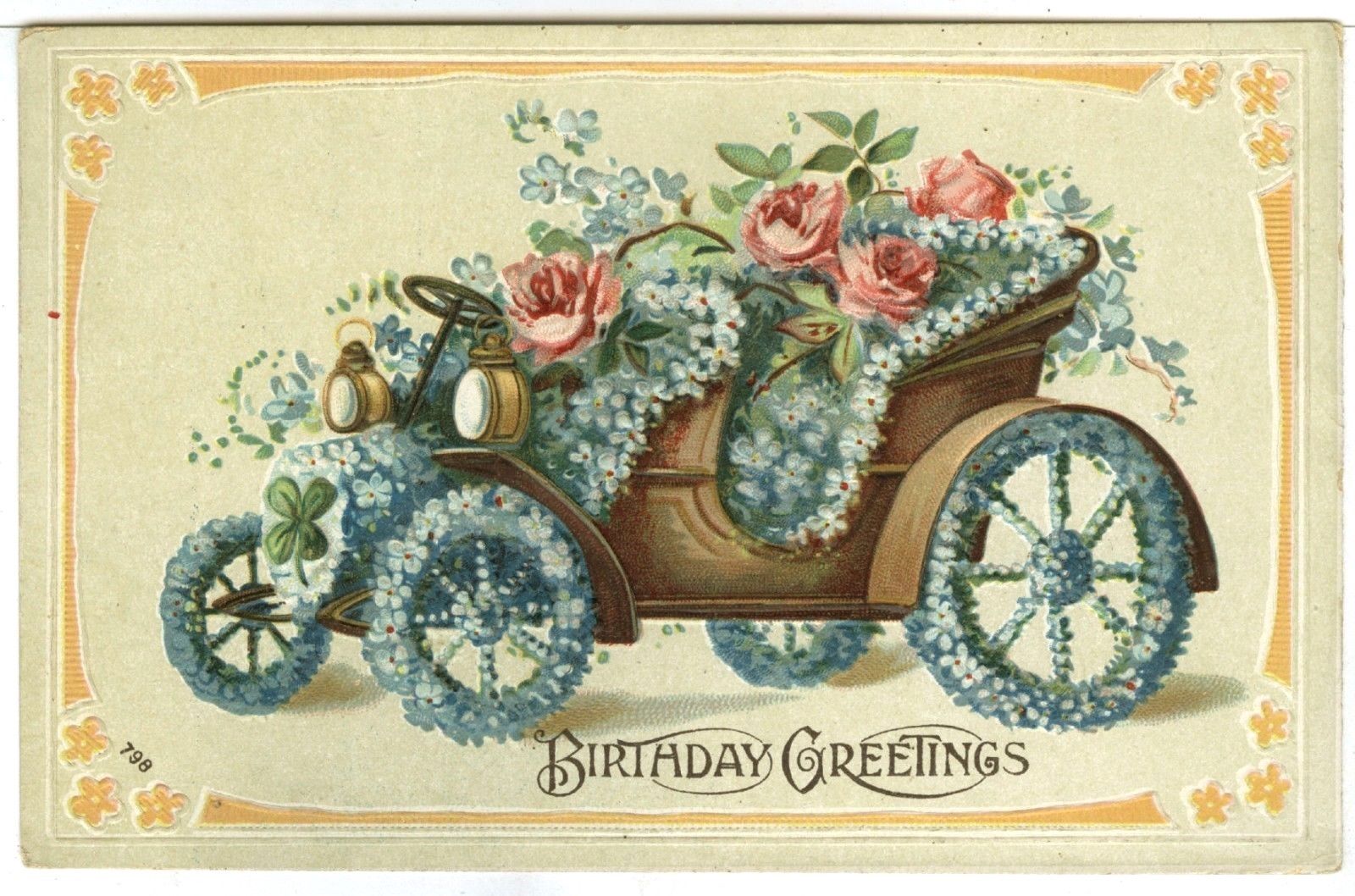 Title (ebay affiliate link): Embossed, "Birthday Greetings", Antique Car with Wheels made of Forget-me-nots