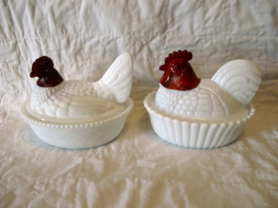 ROSSO ART GLASS 5" ROOSTER/HEN NEST SET,MILK/RED HEAD