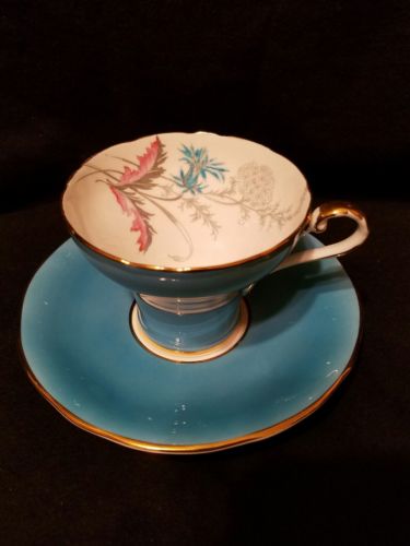 VINTAGE ANSLEY TEA CUP HAND PAINTED ENAMEL BLUE AND GOLD