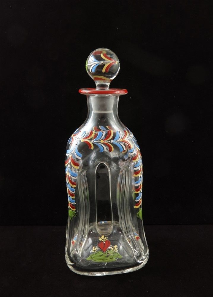 Title (ebay affiliate link): Atq Dutch Danish Mosser Art Glass Pinched Decanter Red & Blue Enamel Detailing