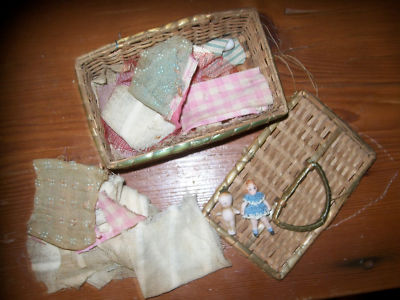 Antique Miniature Sewing Basket w Bisque Kewpie Doll