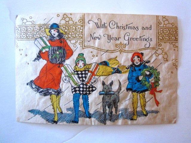 vtg greeting card 20s 30s Christmas New Year snow shopping winter Dog textured
