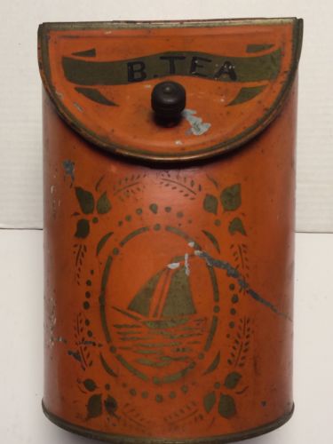 Title (ebay affiliate link): VINTAGE TOLEWARE PAINTED SAILBOAT SHIP TIN COUNTRY STORE COUNTER TOP TEA BIN