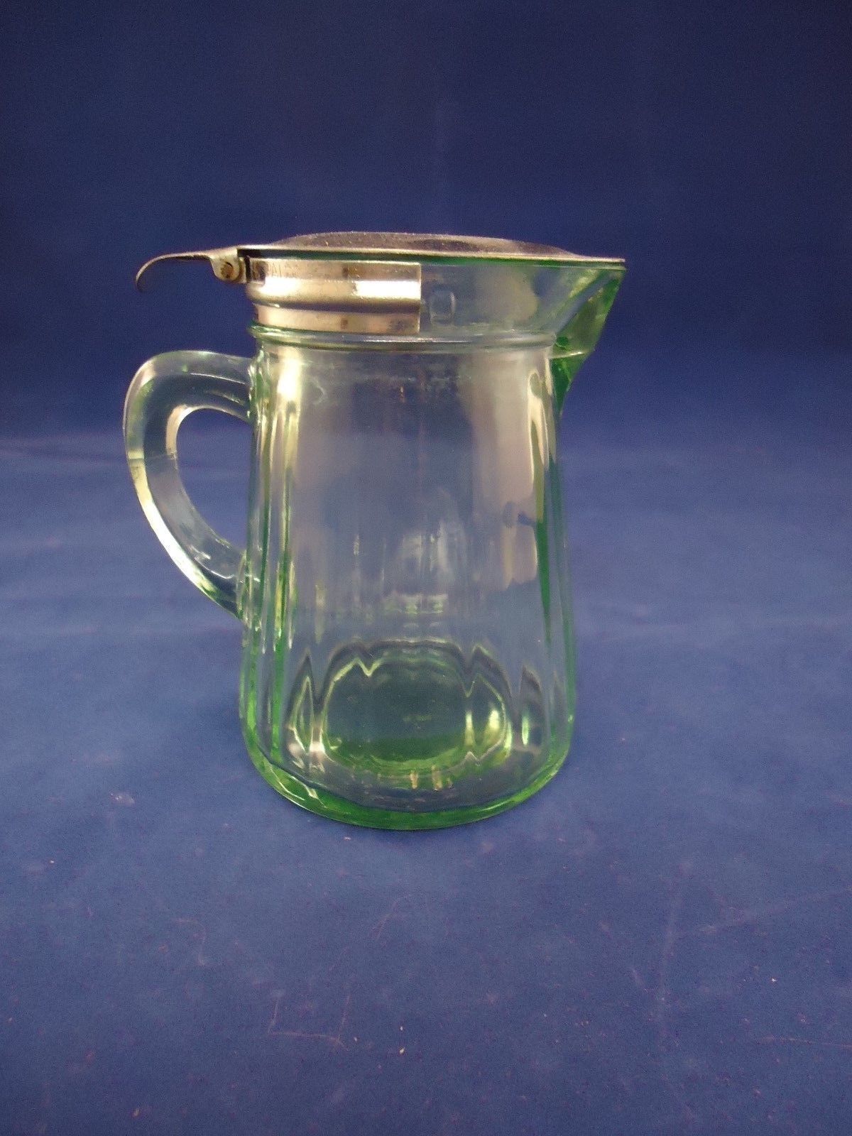 Title (ebay affiliate link): Antique Syrup Pitcher Depression Green Vaseline Glass Metal Lid