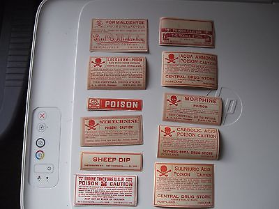 Eleven Old Pharmacy Poison Labels, including Laudanum, Original Gum