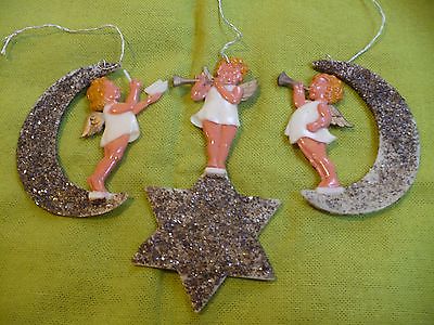 3 Vintage Barefoot Angels on Mica Moon Christmas Ornaments