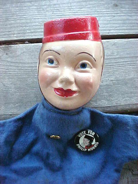 Title (ebay affiliate link): Antique "Johnny" Bellboy Phillip Morris Cigarettes Composition Hand Puppet $35