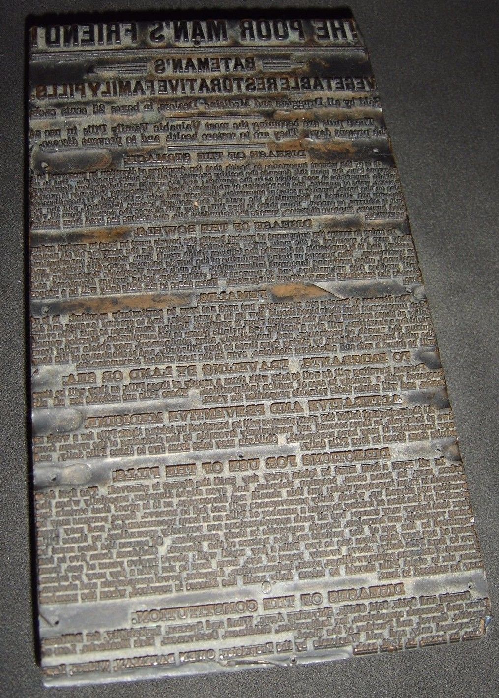 Antique Bateman''s Vegetable Restorative Family Pills Advertising Printer Block