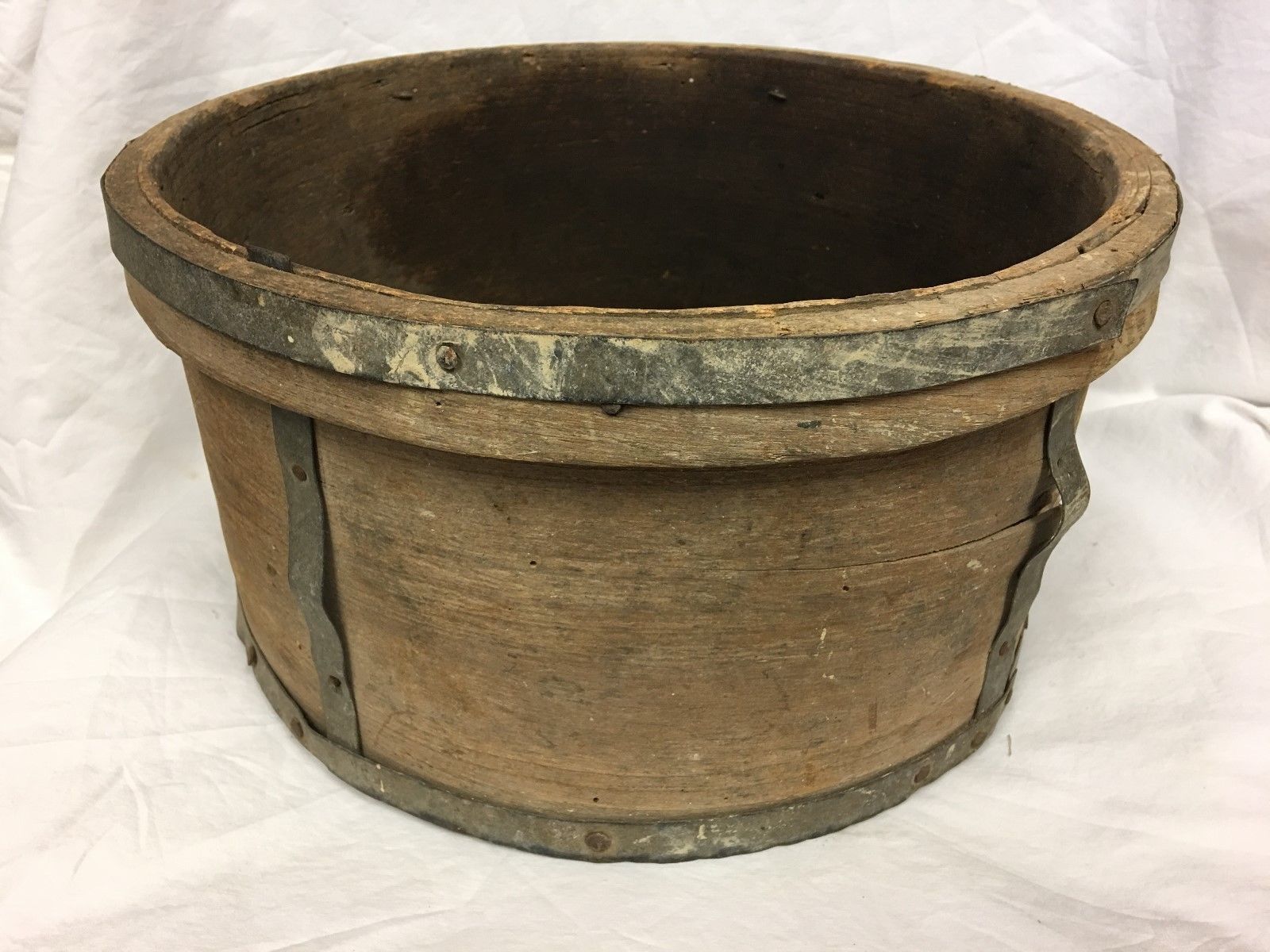 Vintage big 12 inch diameter round wooden box with metal. Rustic