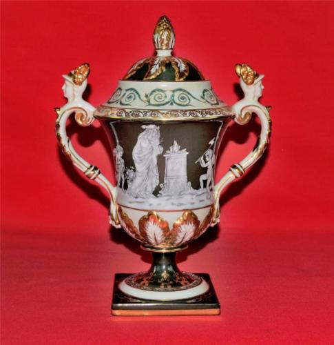 Title (ebay affiliate link): German Austrian Vase Urn w/ Cover Green Gold Trim Pate-sur-Pate Cherubs Nymphs