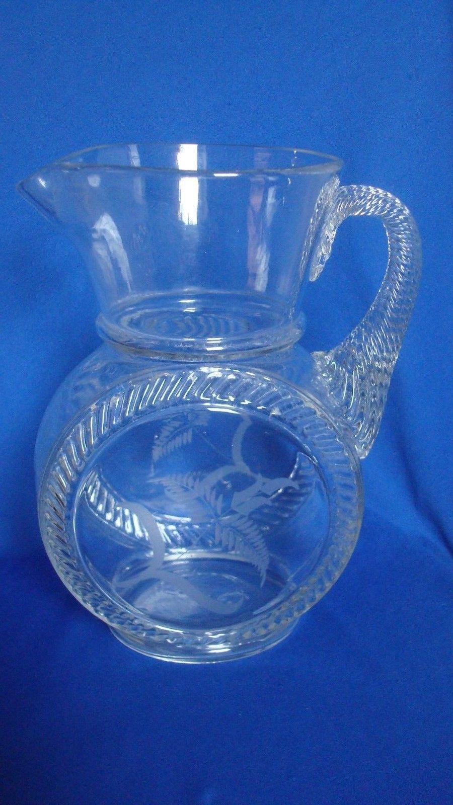 Title (ebay affiliate link): VINTAGE PRESSED GLASS ETCHED TALL WATER PITCHER. TWISTED GLASS HANDLE.