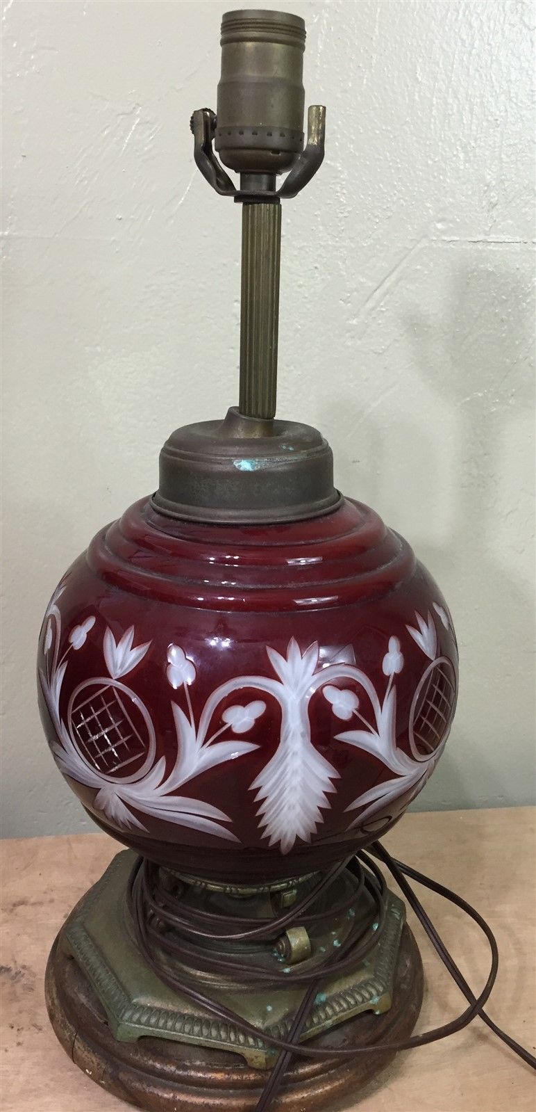 Antique Bohemian Czech Cased Cut Ruby Red Cranberry Glass Table Lamp