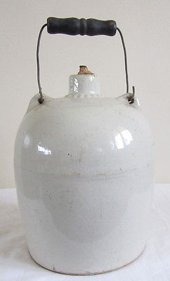 ANTIQUE MOONSHINE WHISKEY JUG STONEWARE GLAZED WOOD WIRE HANDLE CROCK VINTAGE