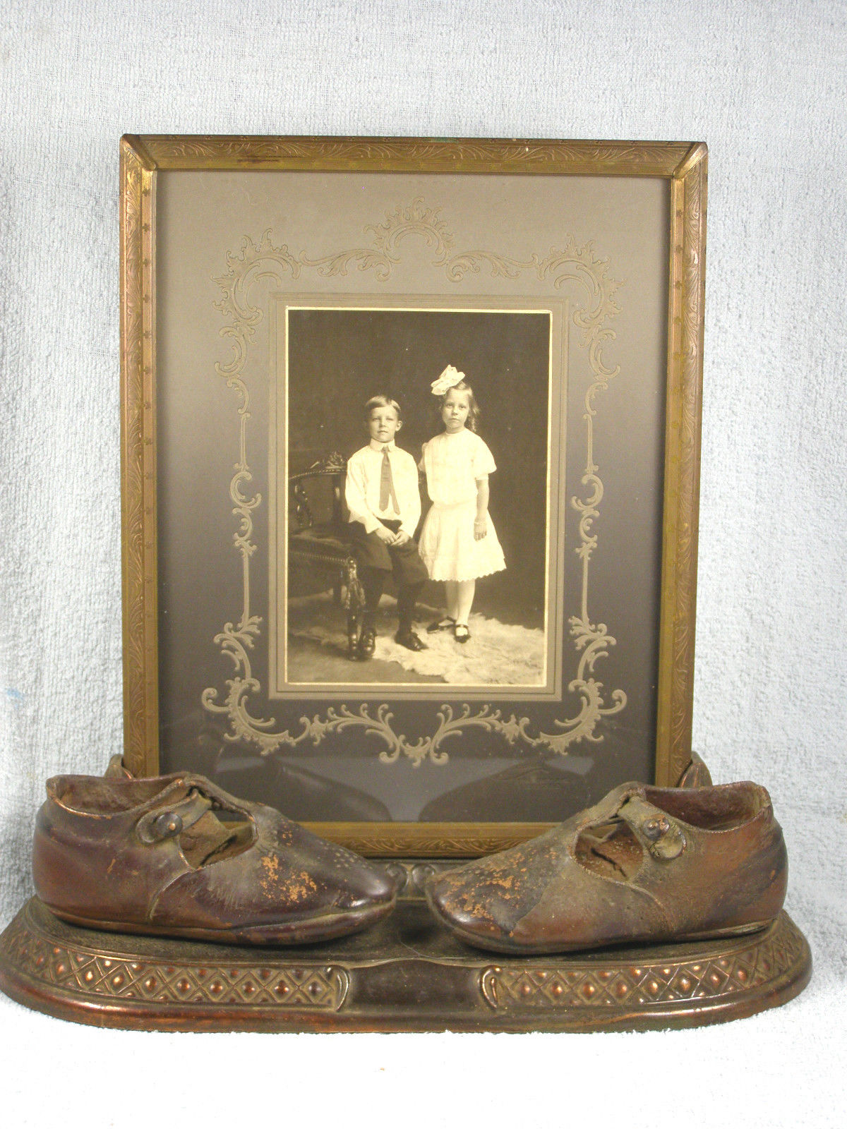 Circa 1920s Bronze Craft Baby Shoes Bronze Plated with Photo Frame