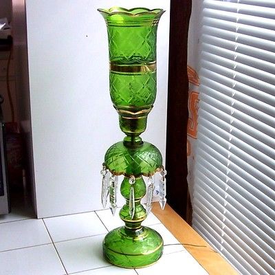 Title (ebay affiliate link): 24" Green Cut Glass Hurricane Drop Luster Lamp Boudoir Sawtooth Arrow Prisms Wrd