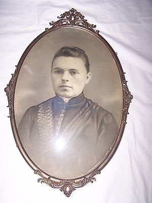 ANTIQUE OVAL METAL BRASS GOLD VICTORIAN BUBBLE CONVEX GLASS FRAME W/LADY PICTURE