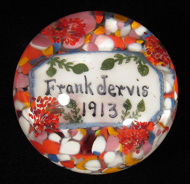 Title (ebay affiliate link): 1913 Antique Glass PAPERWEIGHT Scramble End of Day w/ NAME & DATE Folk Art N/R!
