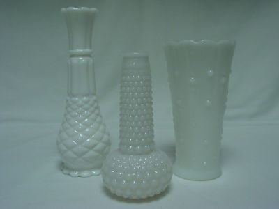 LOT OF THREE VARIOUS PATTERNED MILK GLASS VASES