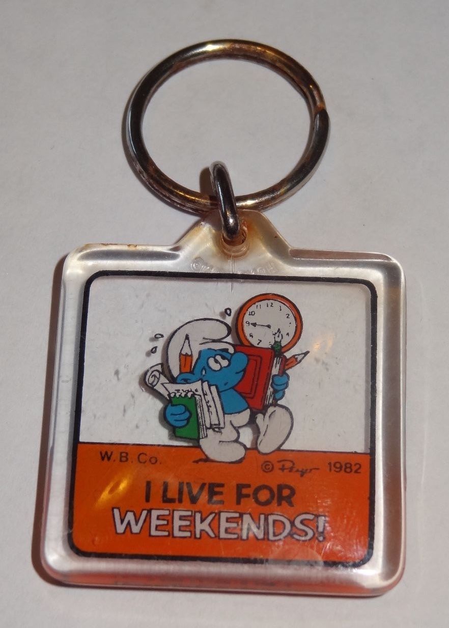 Title (ebay affiliate link): SMURFS I LIVE FOR WEEKENDS! SMURF KEYCHAIN Rare Vintage Made of Clear Acrylic
