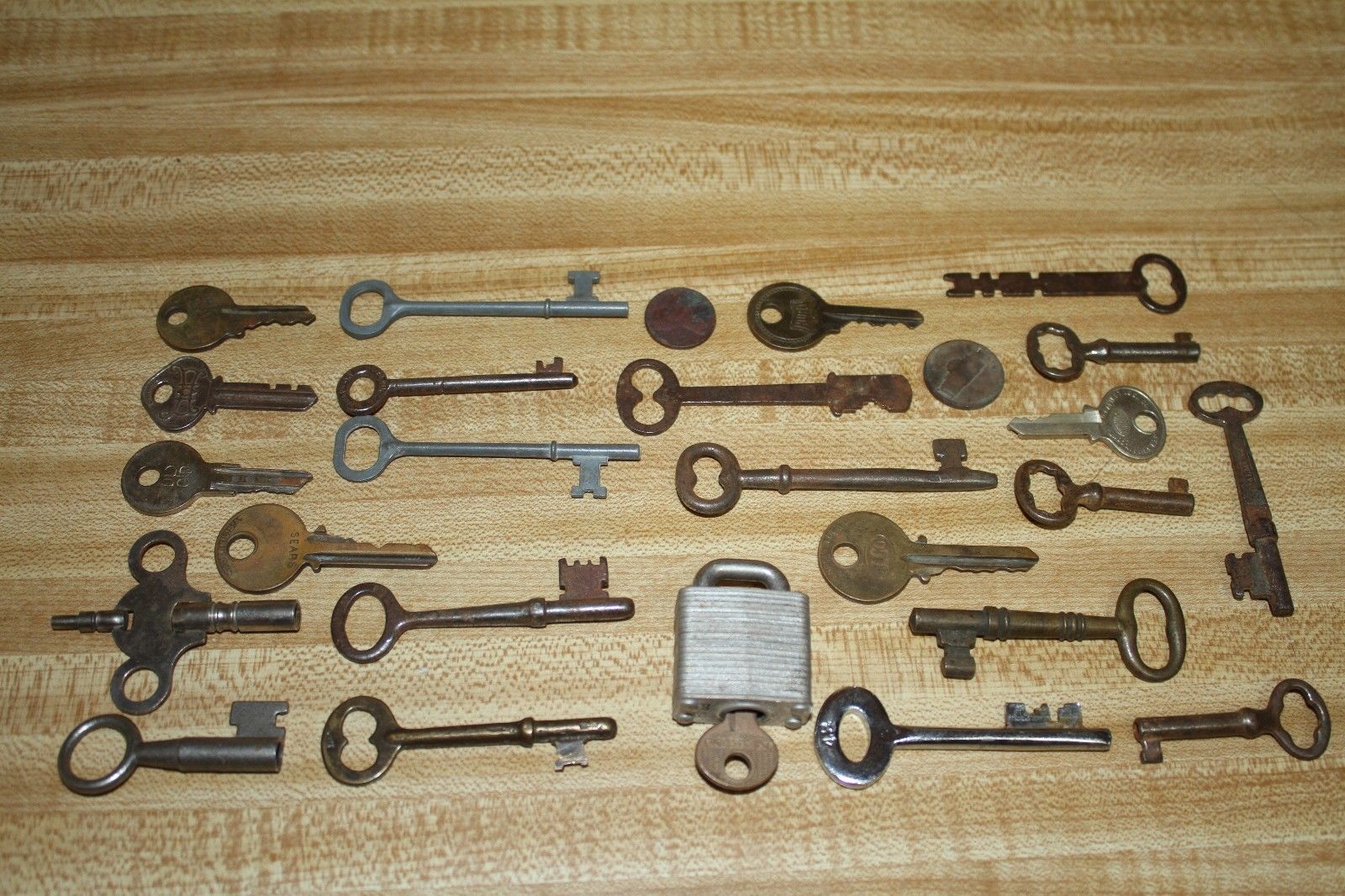 Title (ebay affiliate link): 25x Antique Skeleton Key lot - clock key - lock Russell Erwin sargent &co brass