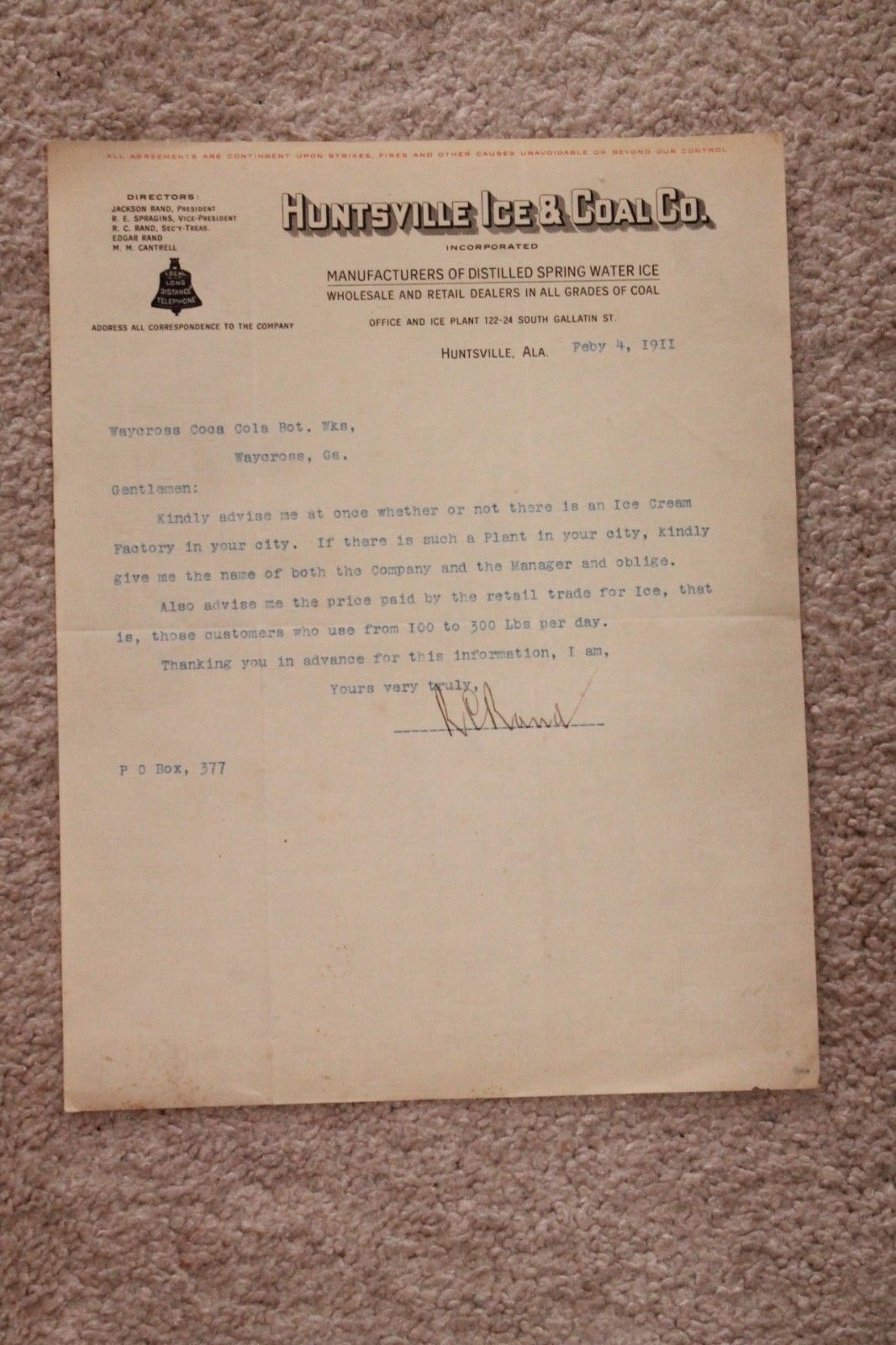 Title (ebay affiliate link): 1911 Huntsville, Ala Huntsville Ice & Coal Co Letterhead Waycross, GA Coca Cola