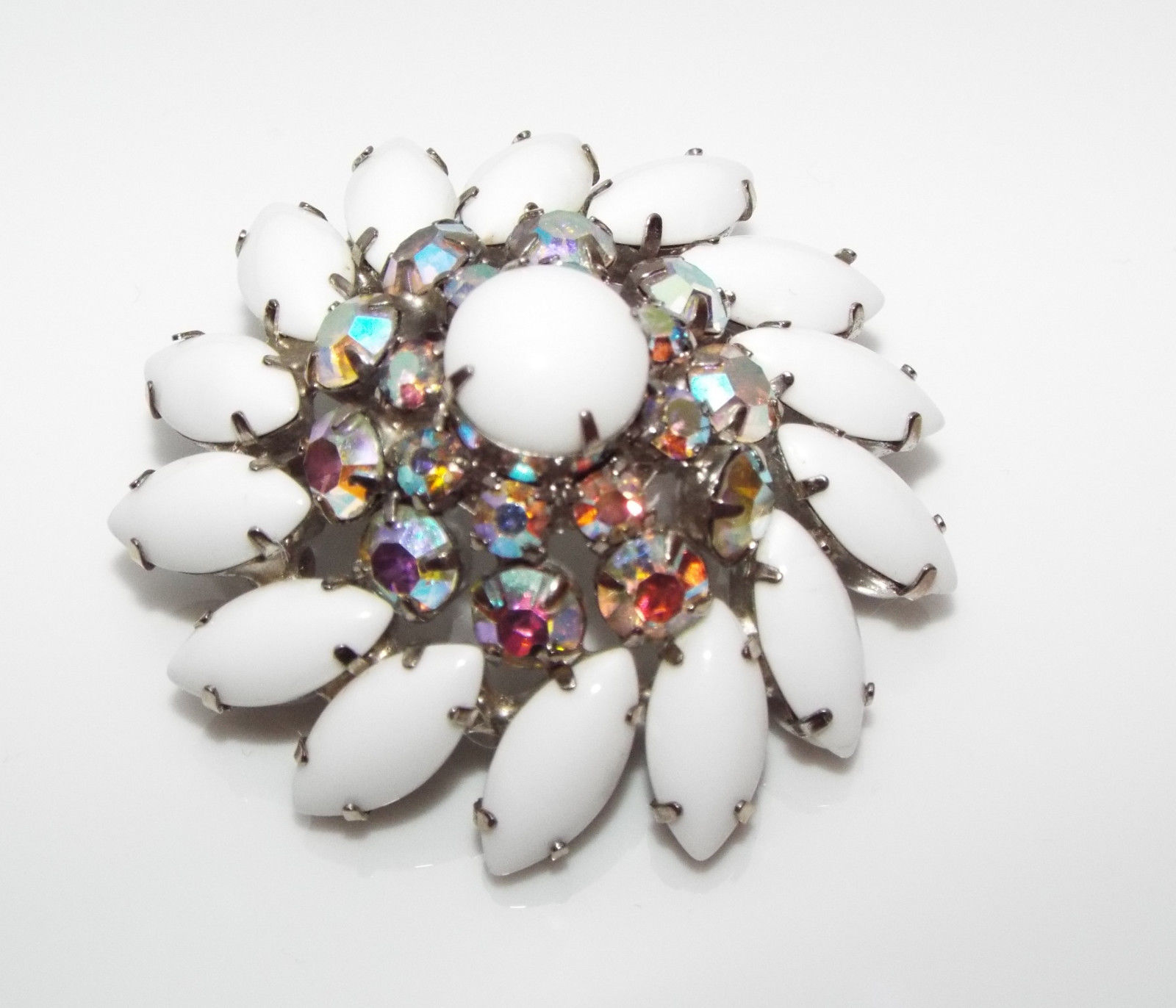 Title (ebay affiliate link): Vintage white milk glass & ab rhinestone BROOCH pin costume jewelry