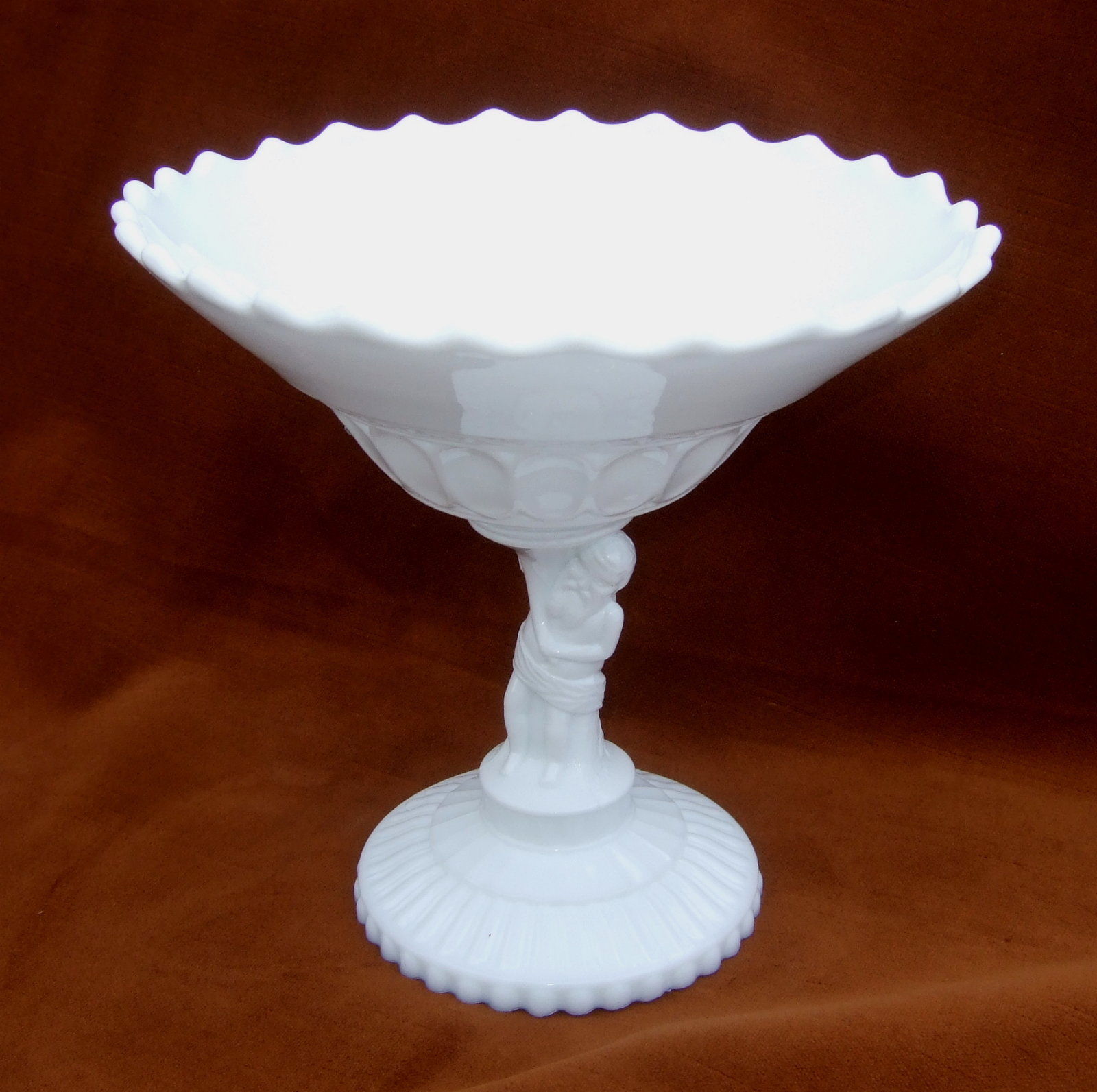 Title (ebay affiliate link): EAPG Milk Glass Figural Compote "ATLAS" Atterbury Glass 1880s