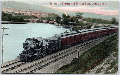 Oneonta, NY Postcard D&H Railway Express Train Electric Lake HAND-COLORED 1909