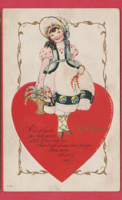 Title (ebay affiliate link): Valentine embossed pc/ little girl w/ hat/dress with hearts/ basket of flowers/