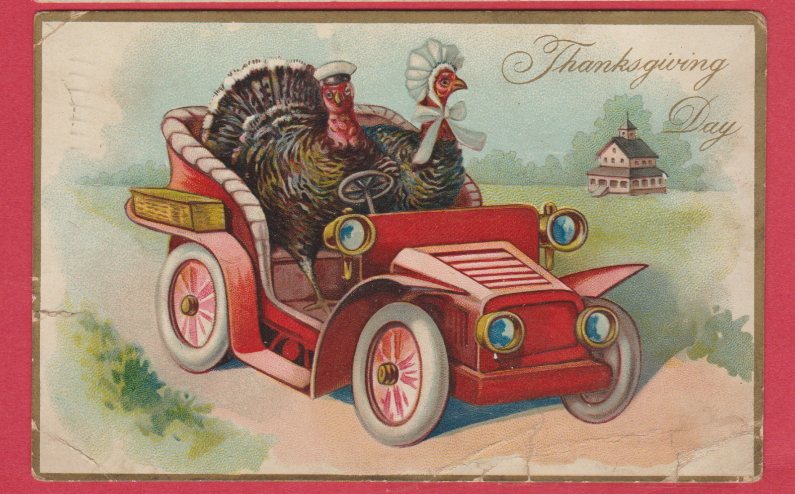 Title (ebay affiliate link): Thanksgiving embossed postcard/ Mr & Mrs. Tom Turkey driving in old car/bonnet