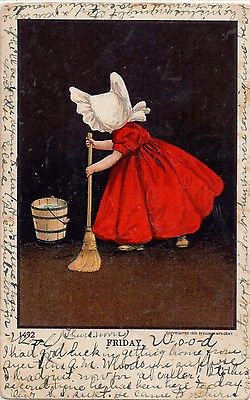 Sun Bonnet Sue mopping floor on Friday Undivided Vintage Postcard PM 1906