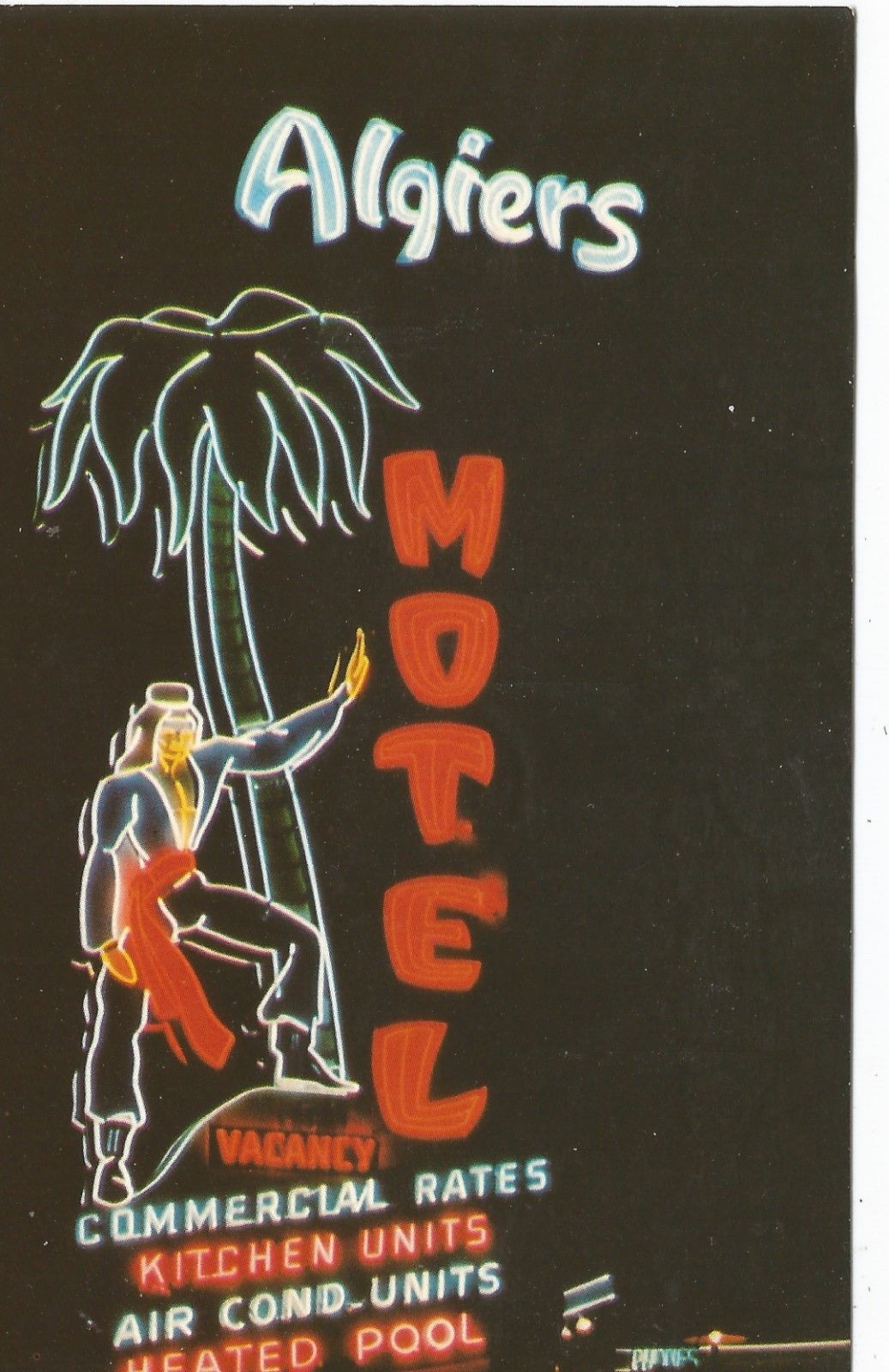 Title (ebay affiliate link): Redwood City CA Algiers Motel Giant Arab Neon Postcard 1960s