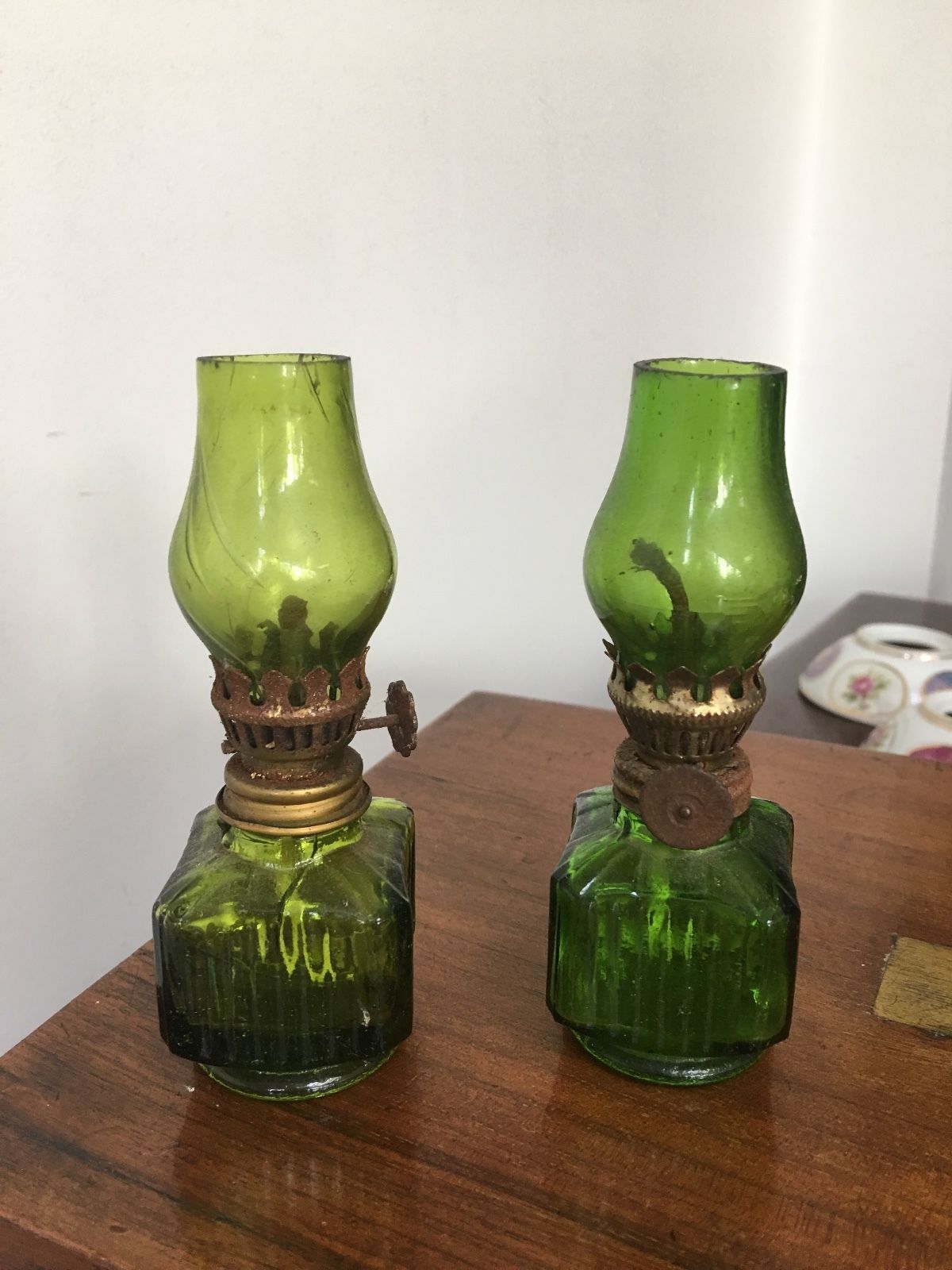 Title (ebay affiliate link): miniature green glass oil lamp, a pair hurricane lamp