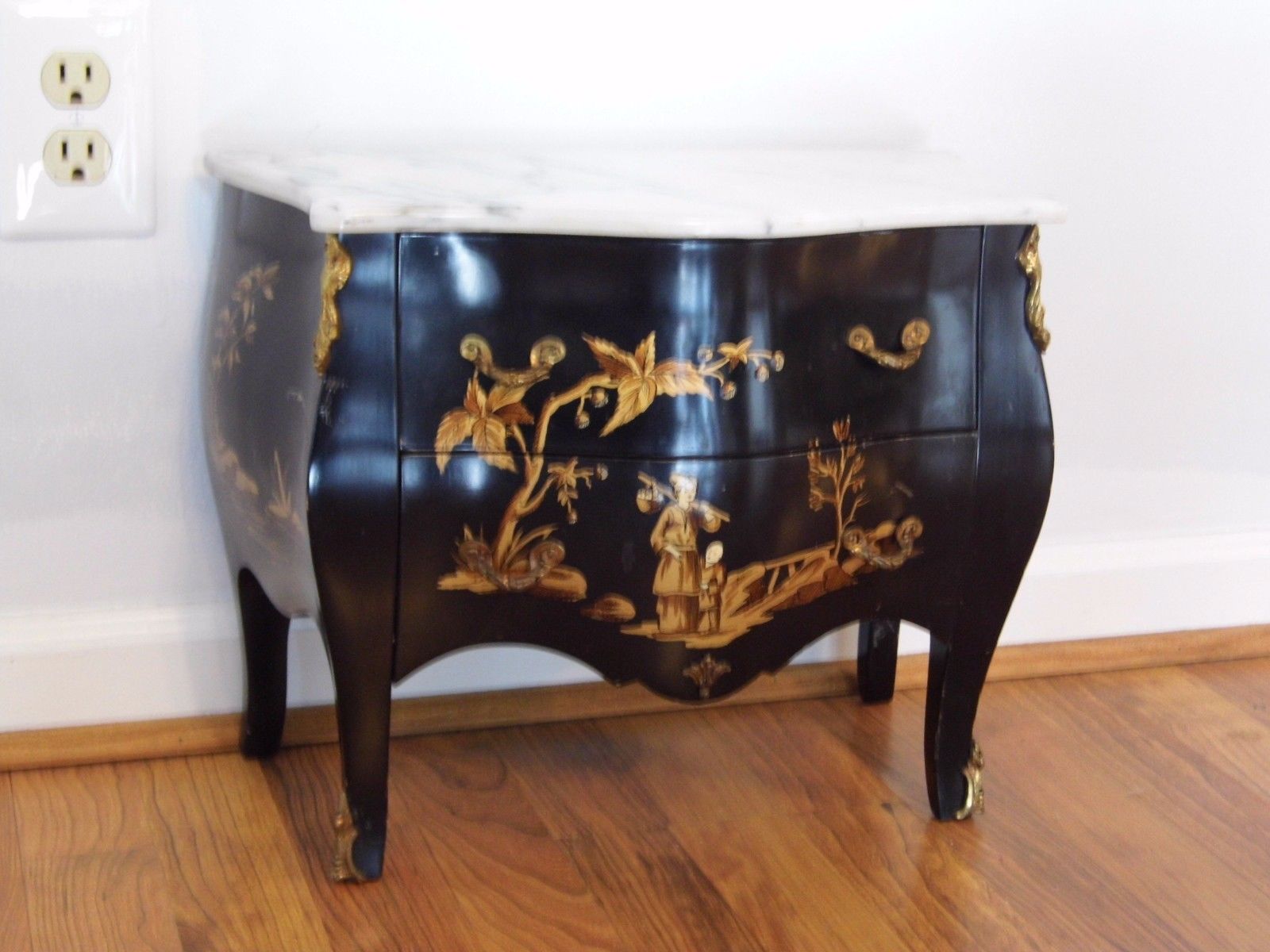 Title (ebay affiliate link): MINIATURE MARBLE TOP CHINOISERIE BOMBAY JEWELRY CHEST Black w/Japanned Gold Leaf