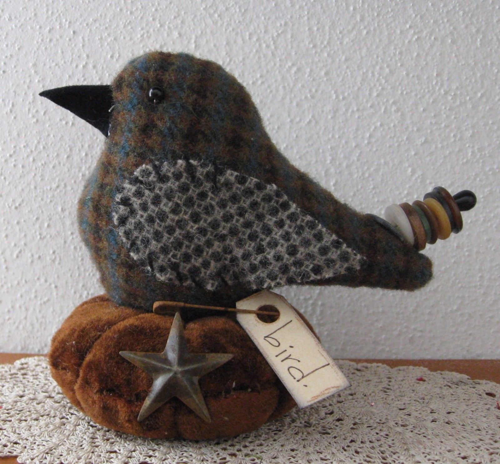 Title (ebay affiliate link): PRIMITIVE WOOL BIRD STAR BUTTONS MAKE DO PIN CUSHION PFATT