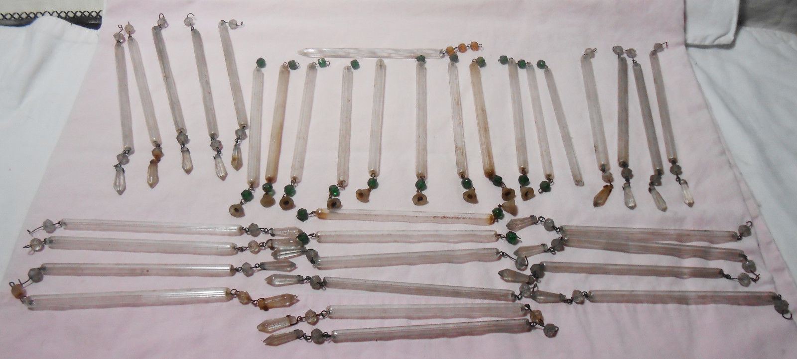 Title (ebay affiliate link): Lot 34 Art Nouveau Czech Glass Crystal Prisms Oil Lamp Light Green Bead Teardrop