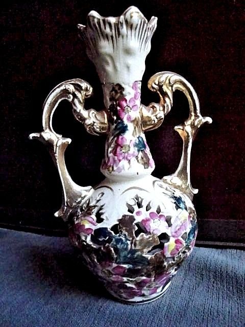 Title (ebay affiliate link): ANTIQUE FISCHER J. BUDAPEST FURNIVALS PIERCED RETICULATED FLORAL VASE