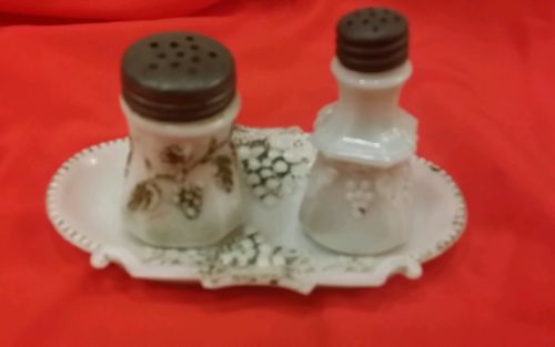 ANTIQUE COLECTABLE MILK GLASS SALT & PEPPER SET WITH TRAY. VERY RARE.