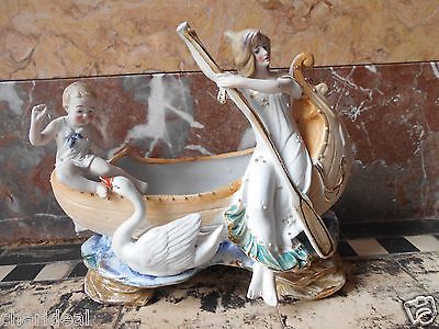 VINTAGE BISQUE FIGURINE VICTORIAN LADY WITH CHILD ON BOATH SWAN