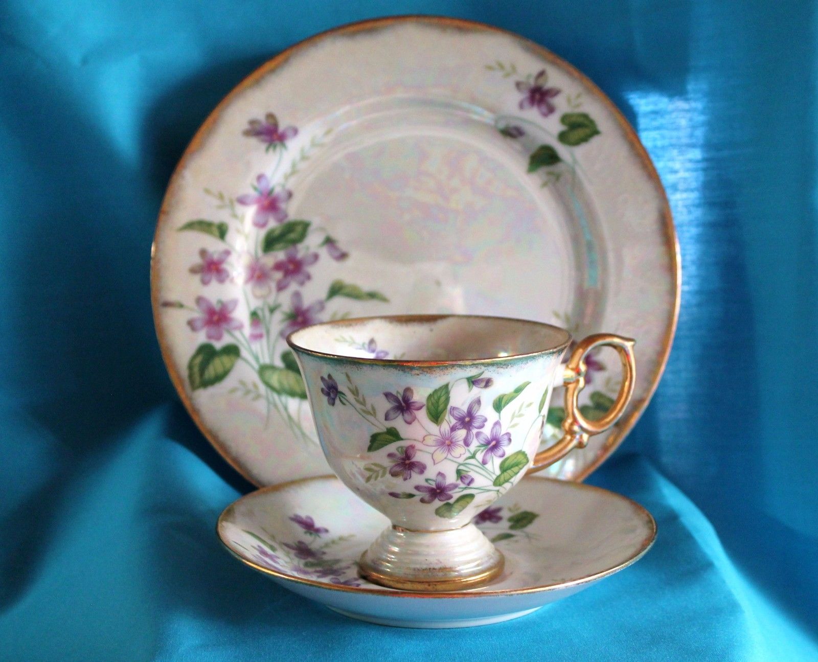 Title (ebay affiliate link): February Purple Violet Plate Cup Saucer Set of 3 Lustre Ware Pearlized Vintage