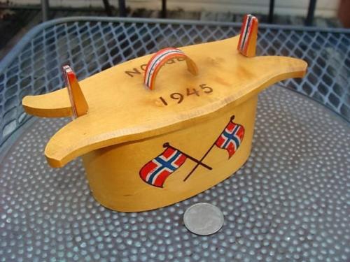Norwegian Tine box painted, flags dated 1945 Norge 6 1/2"